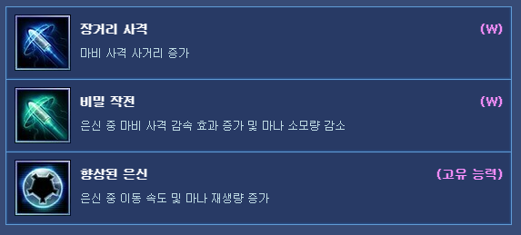 향상된 은신 : 1번누르고 순간적 생존이나 평소 마나관리에 도움됨 나쁘지않음