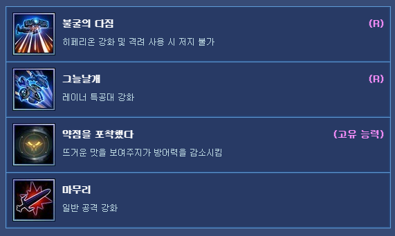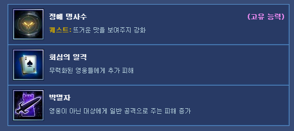 불안정한 혼합물 : 주력특, 패시브를 영웅에게 적중시키면 스킬쿨감에 마나회복 버릴게없음, 여러명맞으면 다터짐
